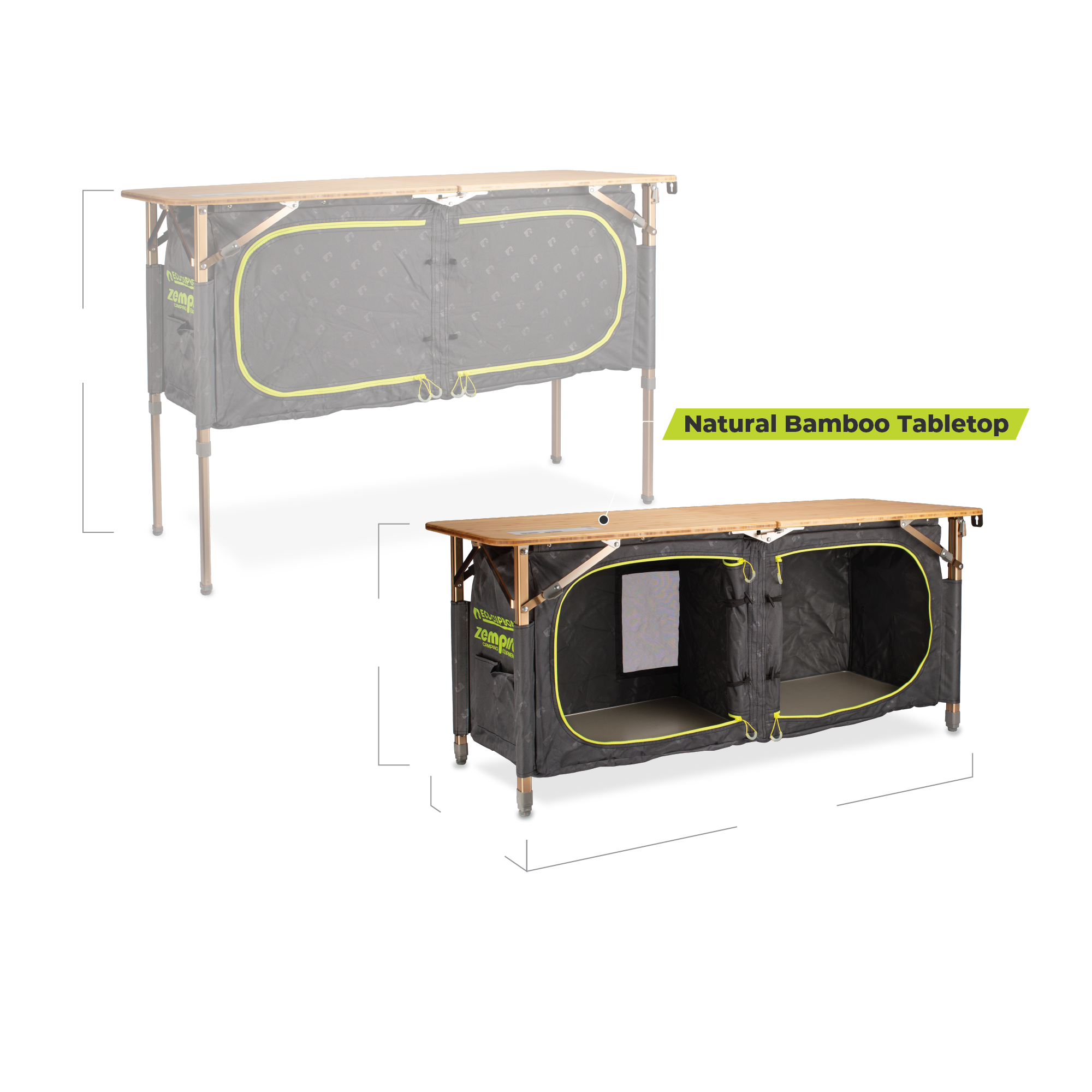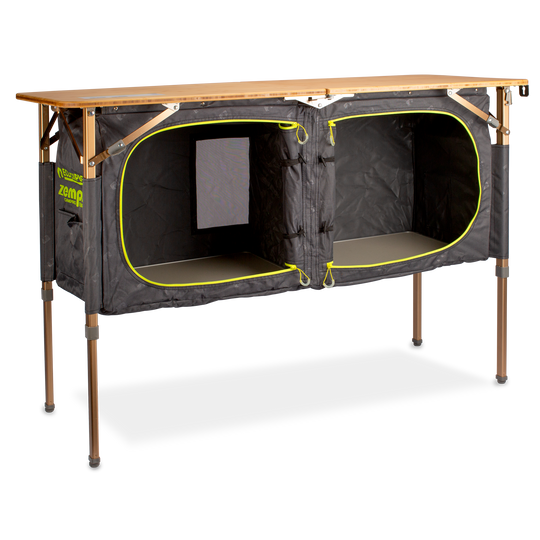 The Zempire Eco Cupboards Camping Kitchen is a smart and adaptable addition to any camp kitchen, bedroom, or living setup. Designed for convenience and durability, it features a wide bamboo tabletop and adjustable height, making it ideal for use as a camping kitchen, food prep surface, or general camping storage unit.